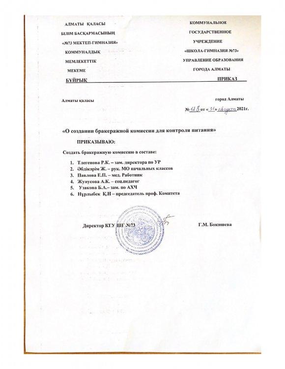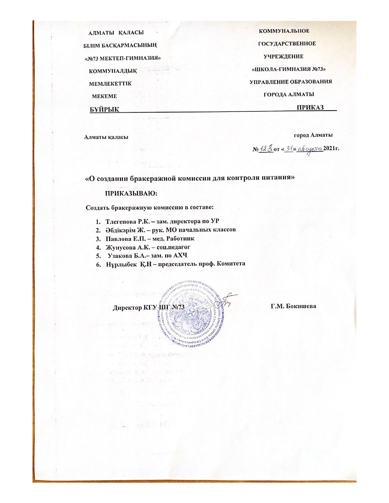 Приказ об организации питания в 2021-2022 учебном году КГУ ШГ №73