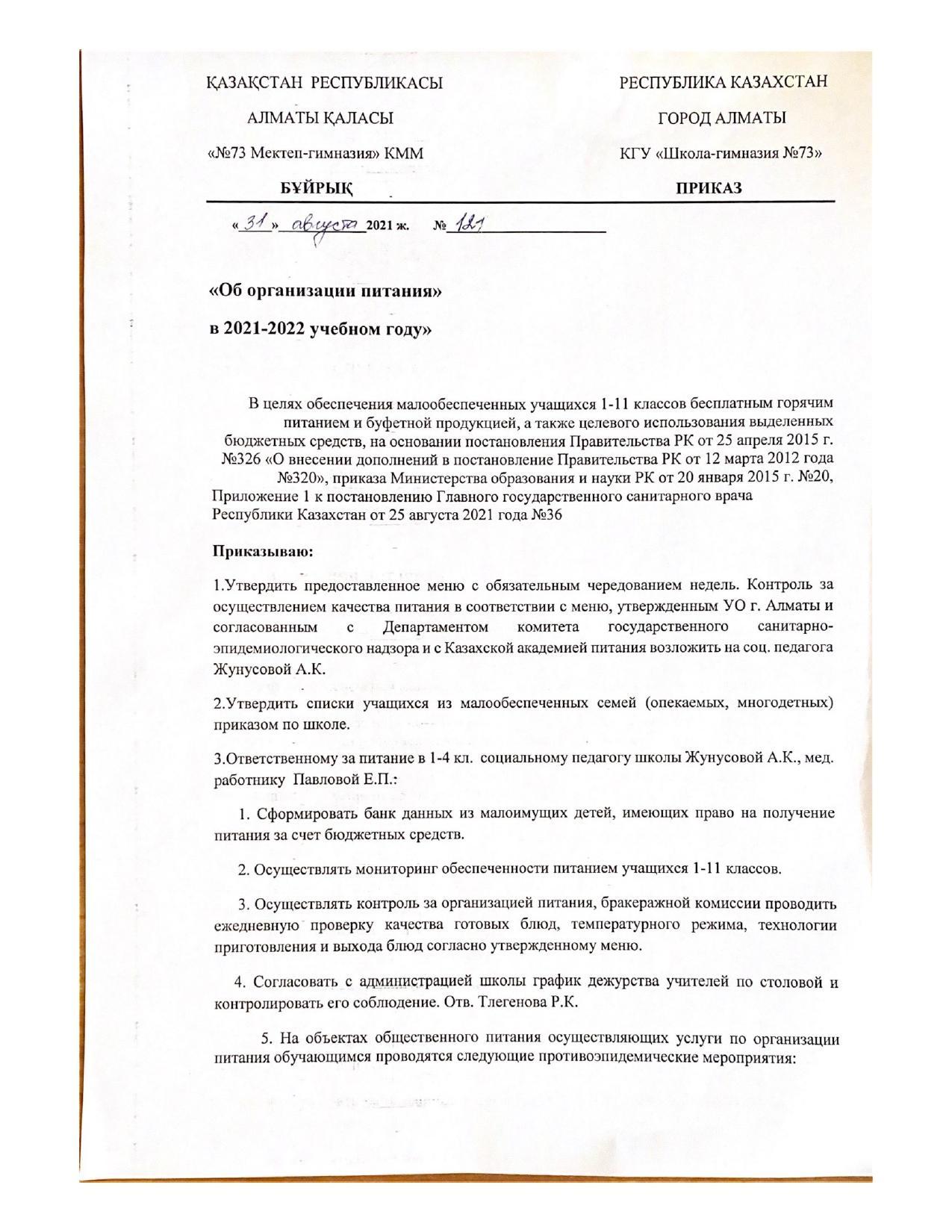» Приказ об организации питания в 2021-2022 учебном году КГУ ШГ №73