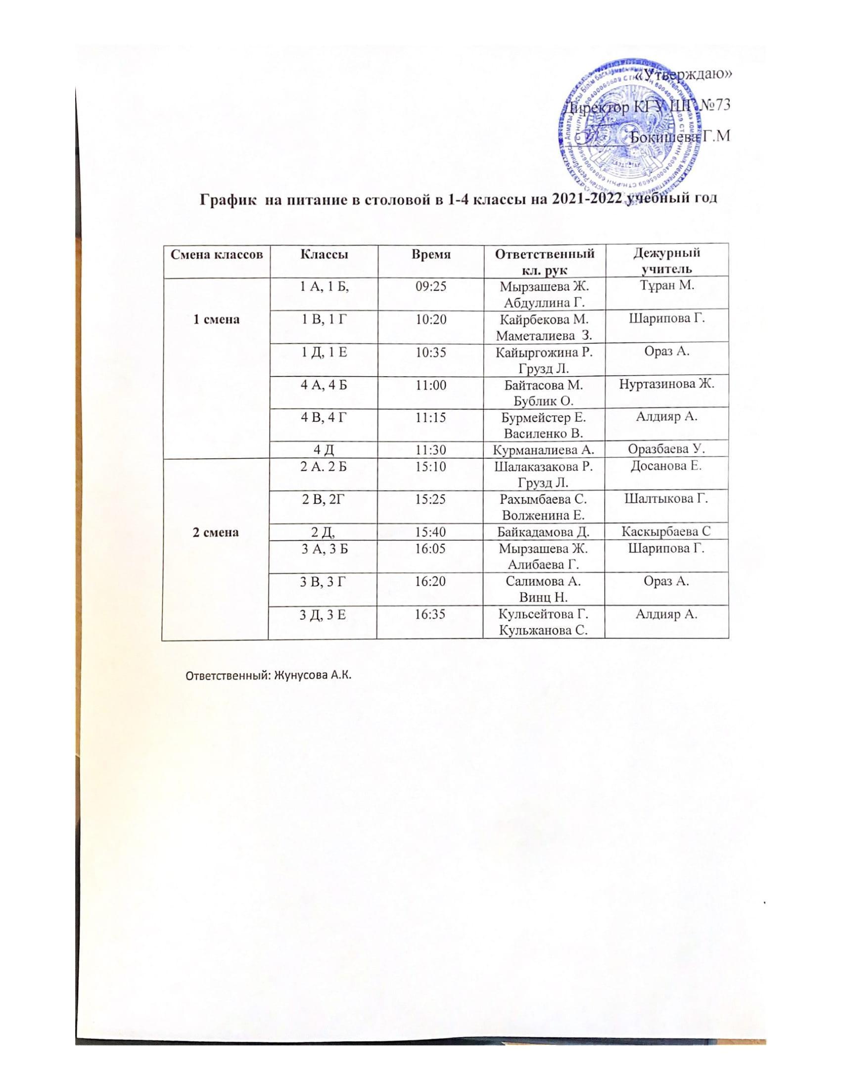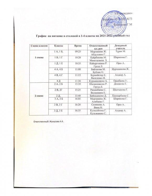 График на питание в столовой в 1-4 классы на 2021-2022 учебный год » КГУ «Школа-гимназия №73» Управления образования г.Алматы
