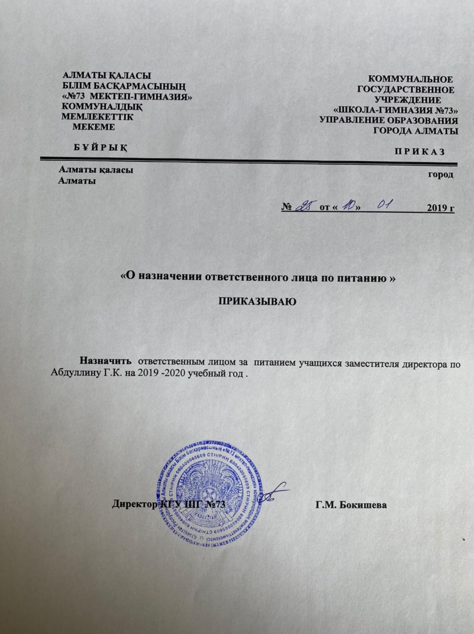 Приказ о назначении ответственного за соблюдением санитарно-эпидемиологических требований КГУ ШГ 73