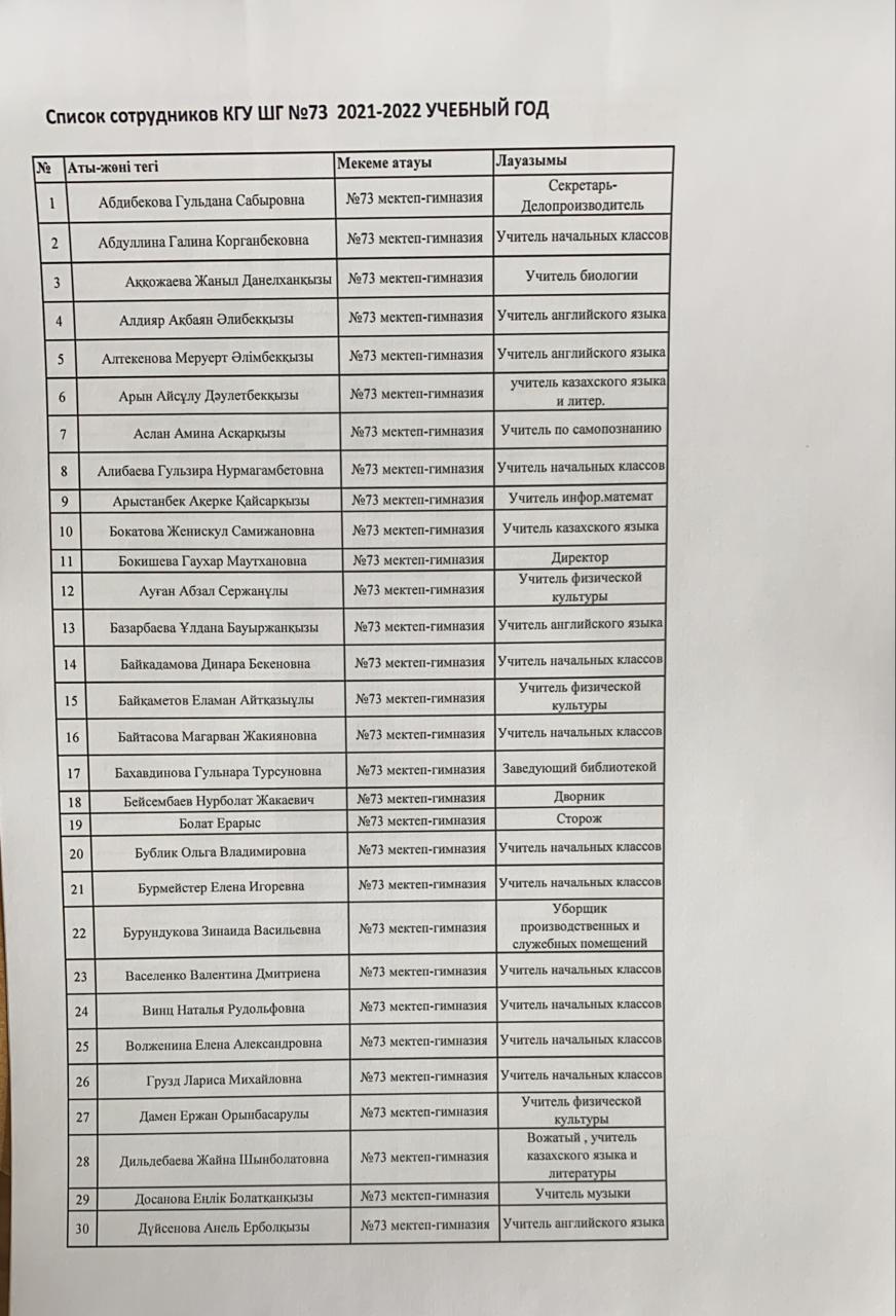 » Список сотрудников КГУ ШГ №73 2021-2022 учебный год