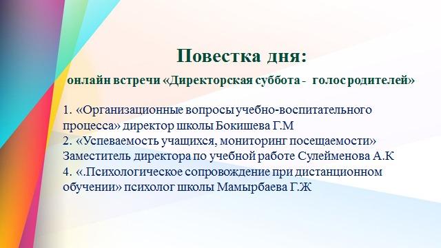24 сәуір 2021 0 1 2 3 4 5 КГУ ШГ №73 онлайн-встреча «Директорская суббота-голос родителей» 24.04.2021год.