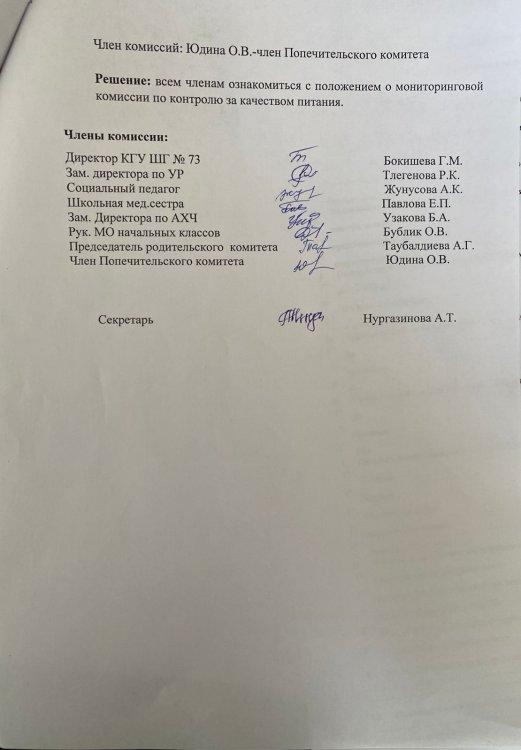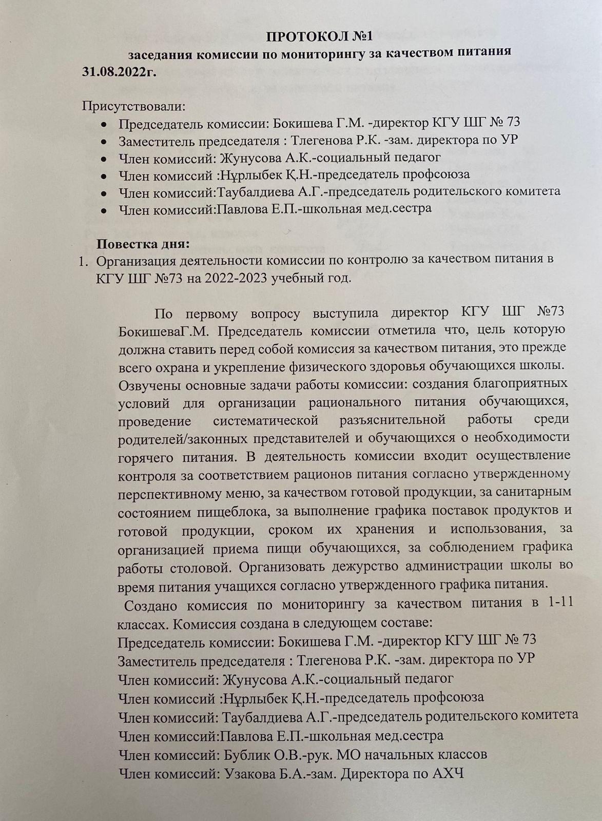 Протокол №1 заседания комиссии по мониторингу за качеством питания